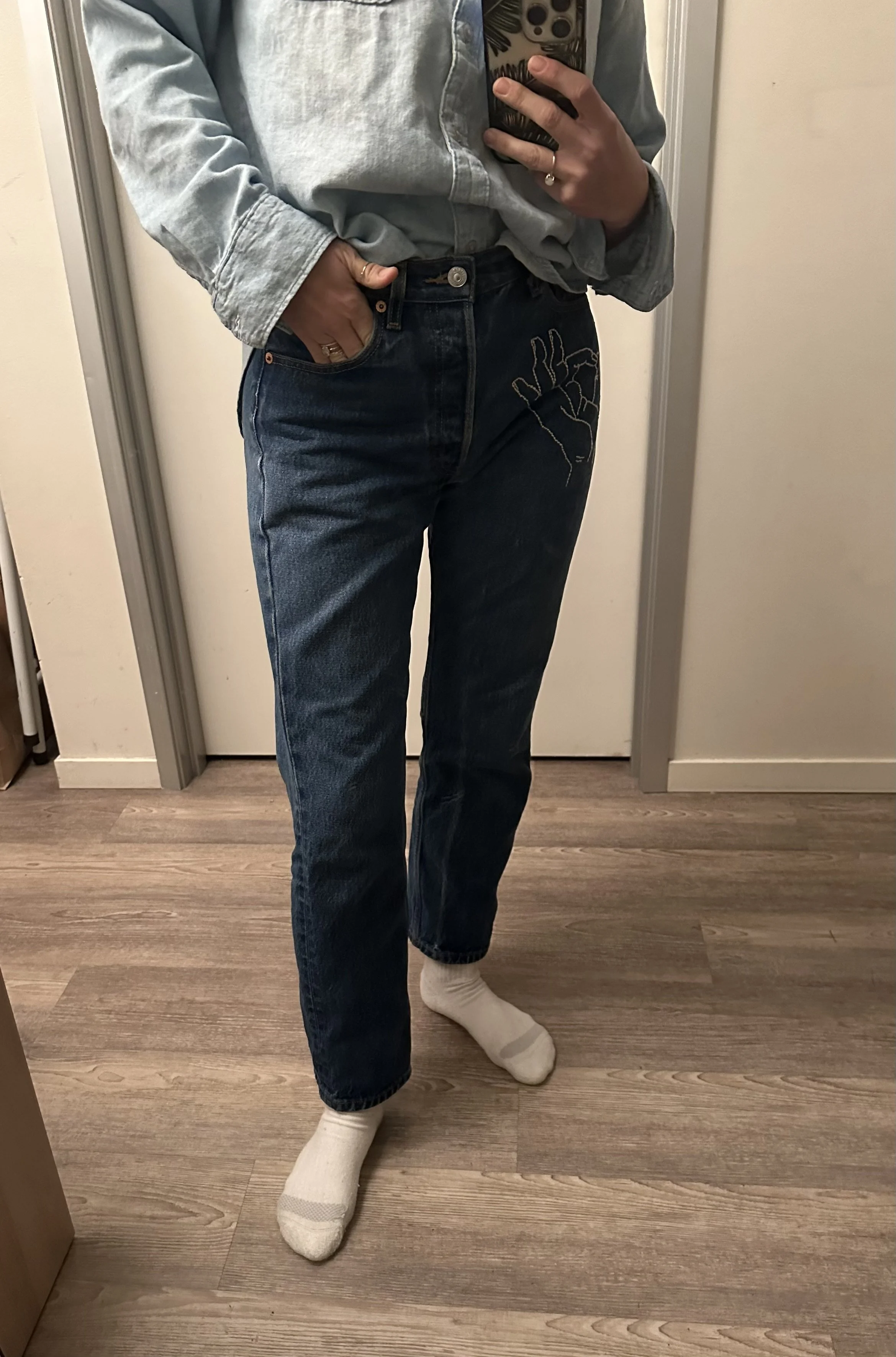 When I got home, I threw the jeans into the wash on a quick cycle just to get them wet but wrung out. You don’t want them sopping, just damp. Once I got them on (this was tricky) and buttoned, I started doing squats, lunges and just sort of walked around the apartment, getting them to mold to my body and stretch in the natural places like my waist and knees. Once I felt like they started to loosen a bit, I took them off and hung them up to dry overnight. The next morning, they had loosened in all right places and slid on effortlessly as if they were made for me! This trick really does work (I’ve since tried it on other pairs of stiff denim that I own) as long as you can bear to wear damp jeans for 5-10 min, haha.